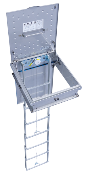 シルバーハッチはステンレス製で、錆や腐食に強く、非常時は上蓋を開いて開放レバーを押すだけで素早く安全に避難ができます。標準タイプの他に、設置環境に応じてさまざまなラインナップを揃え、消化器・消火設備メーカーに提供しています。